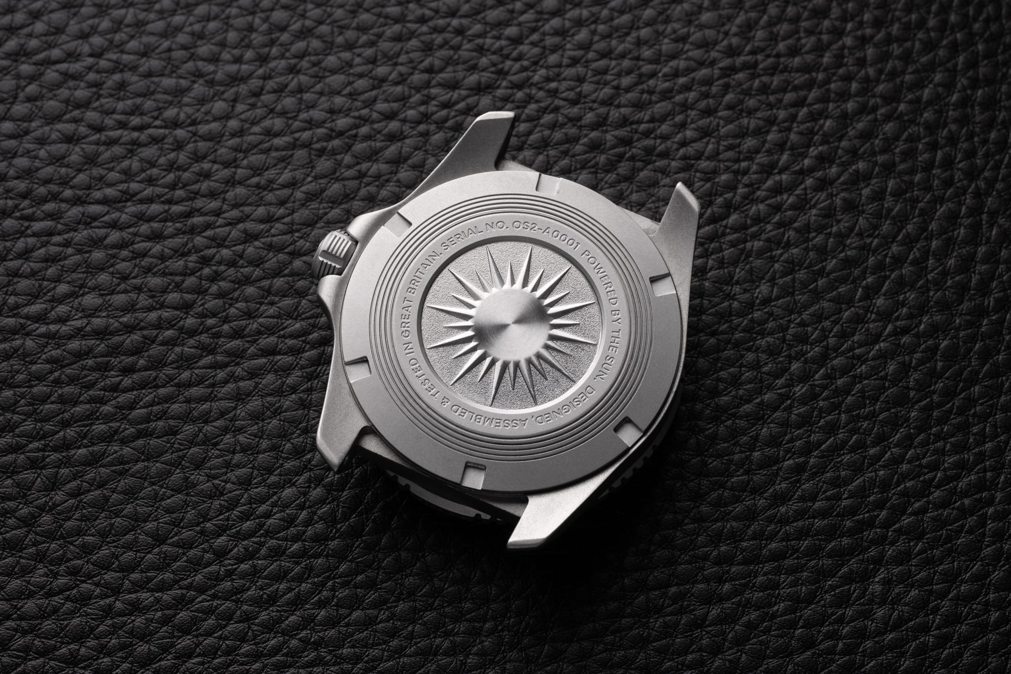 The mid-case profile has a subtle arc and soft, discrete bevels that run along the top of the case. The closed caseback sits flush against the wrist and features a really striking embossed stylised sun at its centre surrounded by engraved specifications and concentric circle design.
