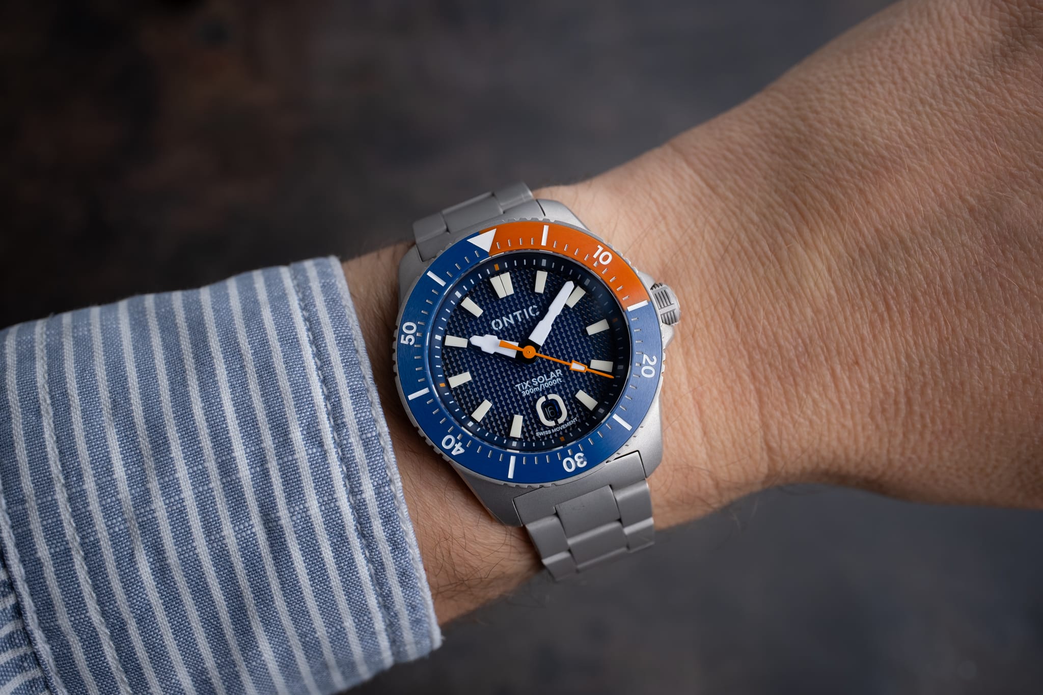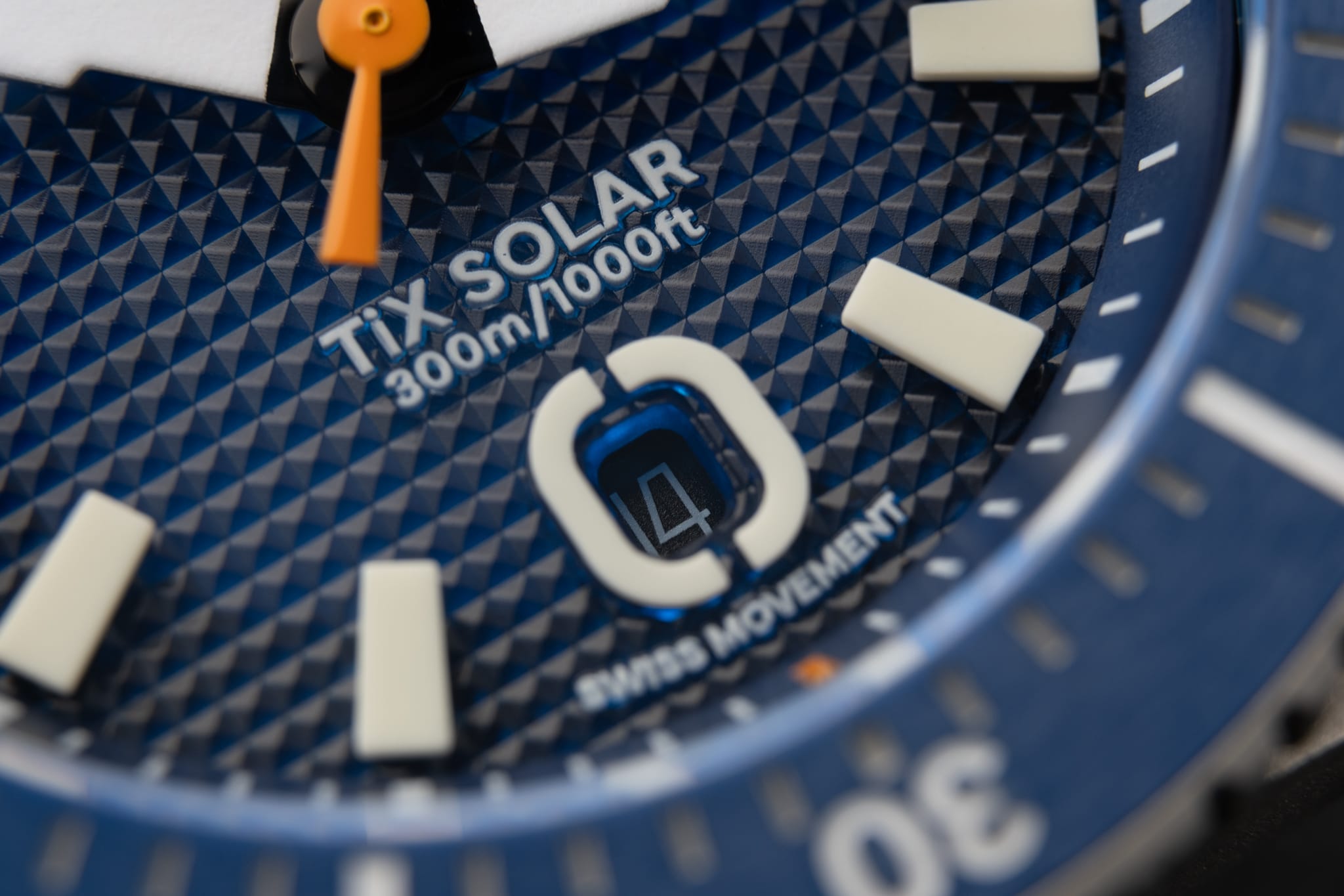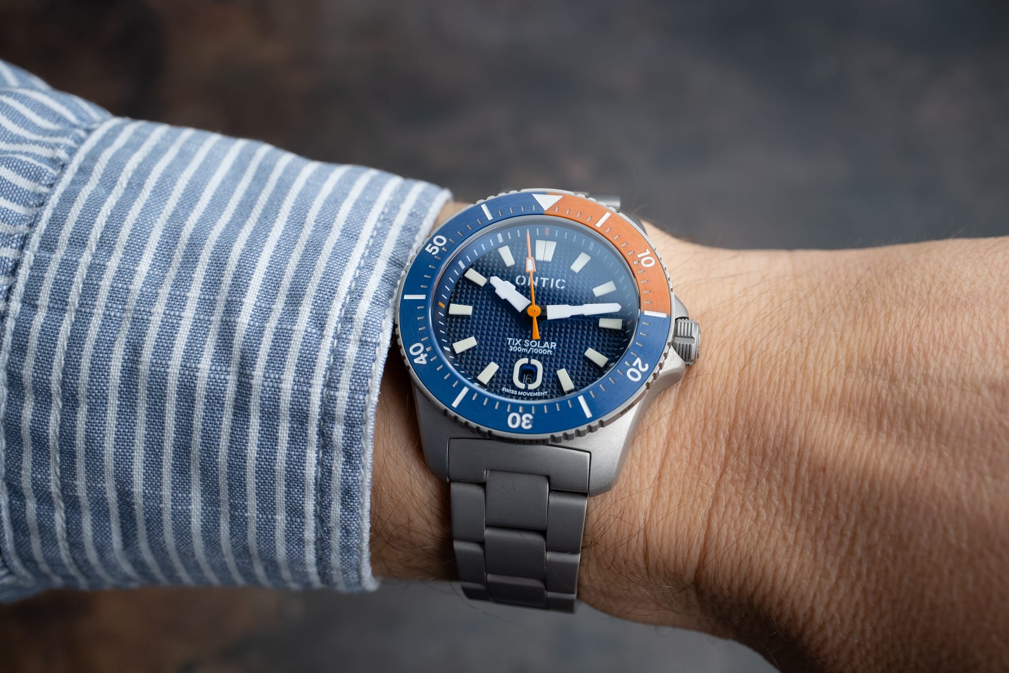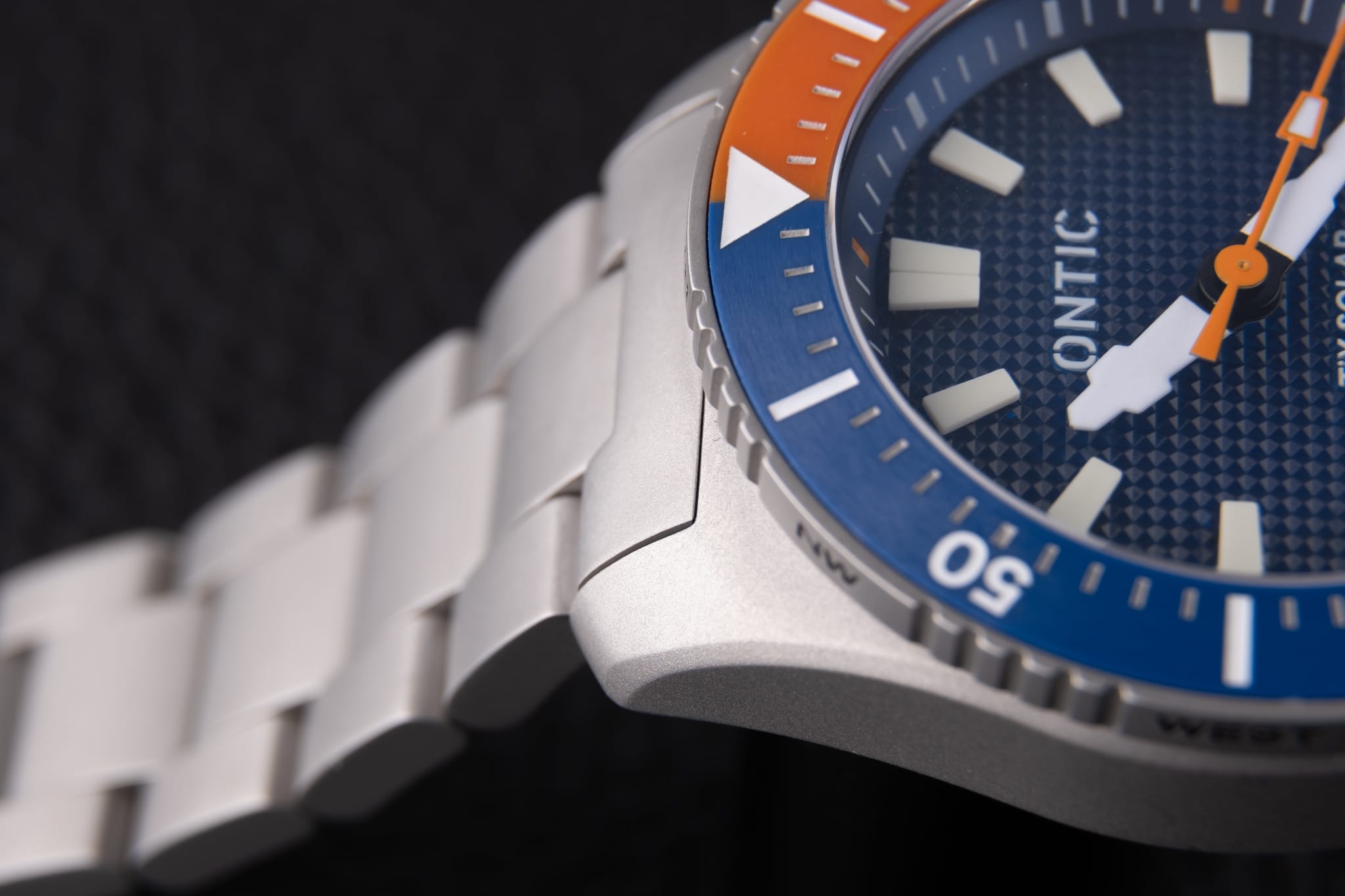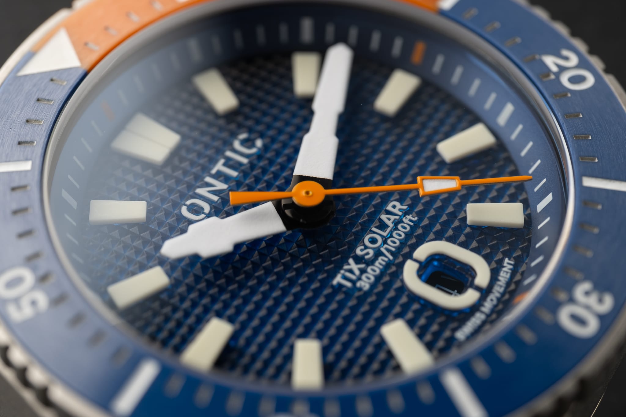 Working from the outside in, a simple minute track is printed in white onto the deep, sloping rehaut. On the Marine Diver the minute markers at 3, 6, 9 and 12 o’clock are accented in orange to match the bezel, whilst the Duty collection watch is printed white only. The bold isosceles trapezoid-shaped hour markers are cast from solid blocks of Super LumiNova. A date window sits at six o’clock surrounded by an applied and lumed frame which mimics the stylised ‘O’ from the brand’s logo, a nice touch! However, the date window itself is recessed so deep into the dial that it’s actually difficult to read it. On my review watches the date window was colour-matched, but at time of publishing John is yet to decide whether to keep it colour-matched or go black-on-white. There are pros and cons to each option, but for this particular watch I’d personally prefer black on white. The reason being that the date window sits so deep into the dial that legibility suffers. The hour and minute hands are bold and feature a design which is unique to Ontic, something that’s always nice to see. The seconds hand, orange on the Marine, black and white on the Duty, has a lume pip that echoes the shape of the hour markers. Dial text comprises the Ontic logo at 12 o’clock, balanced by ‘TiX SOLAR’ and ‘300m/1000ft’ at six. ‘SWISS MOVEMENT’ in smaller font beneath the date window.