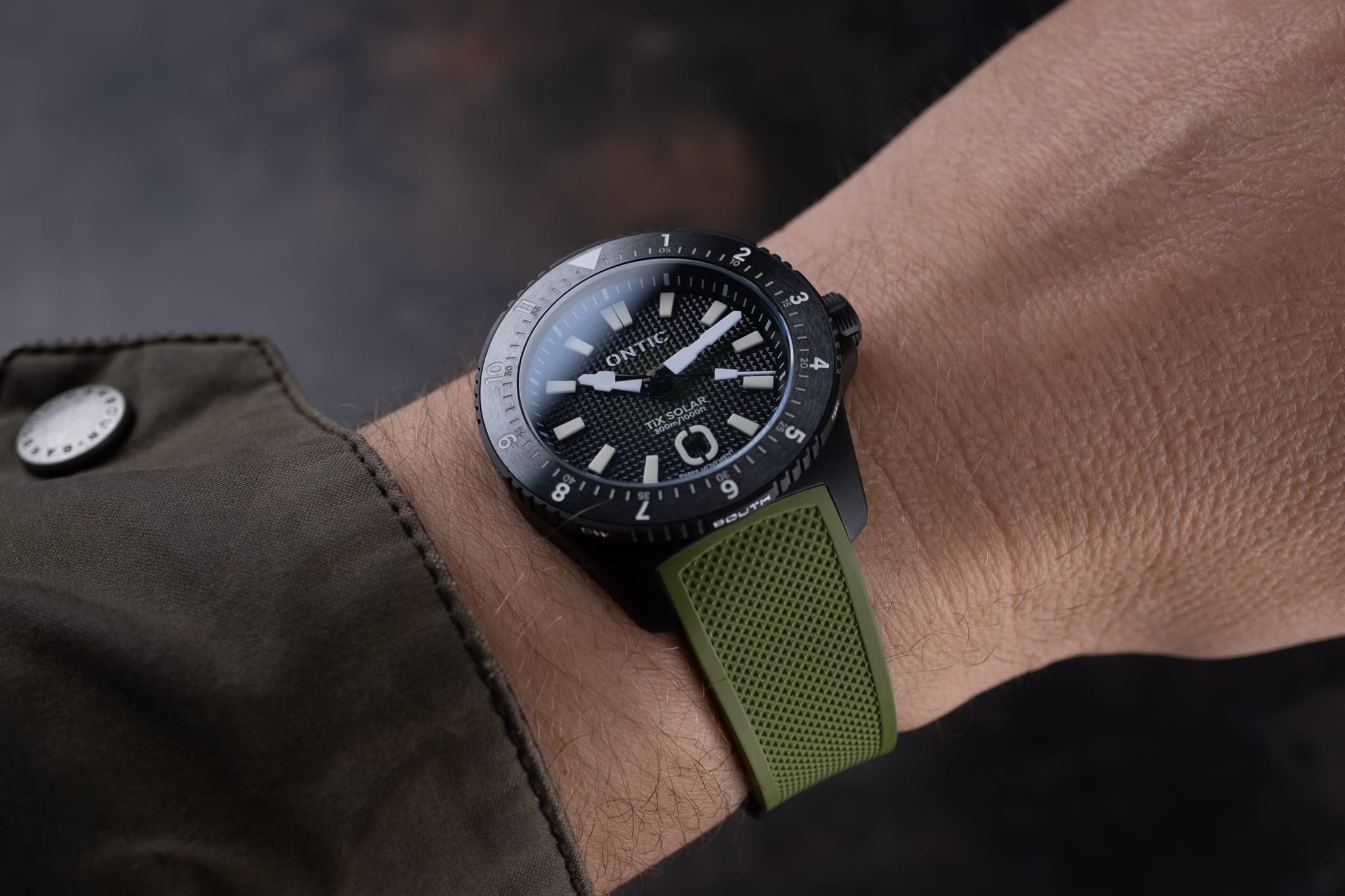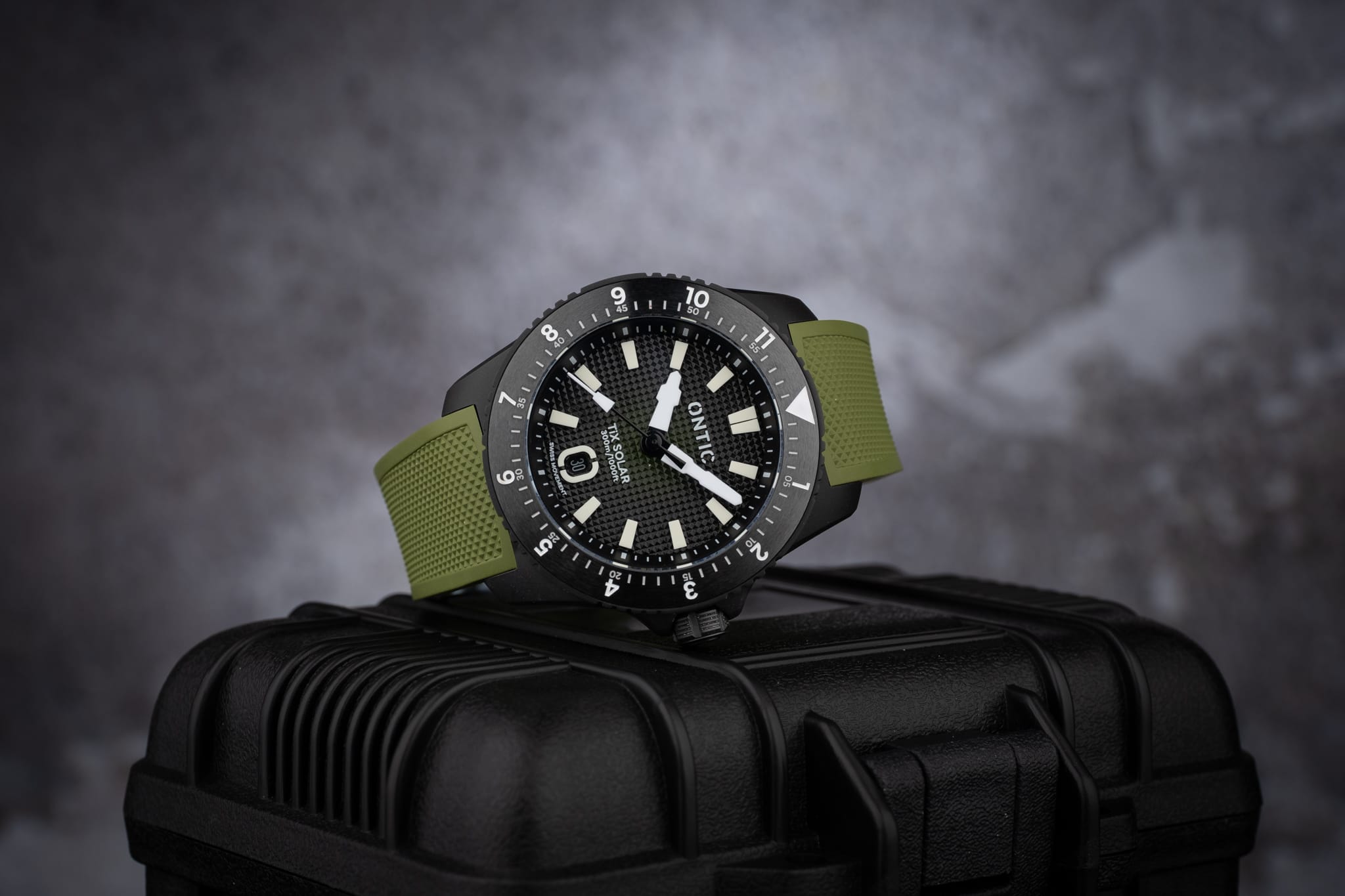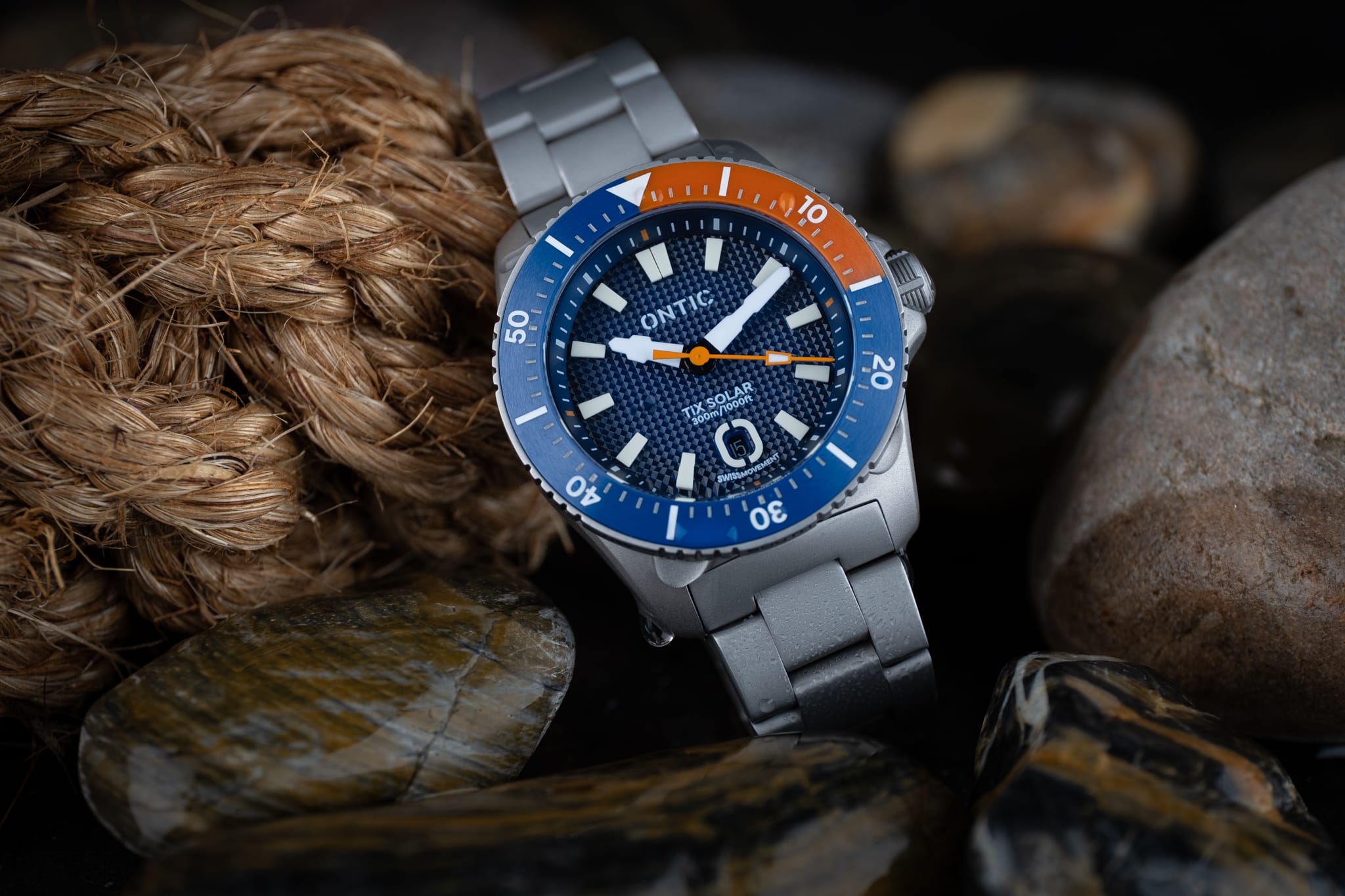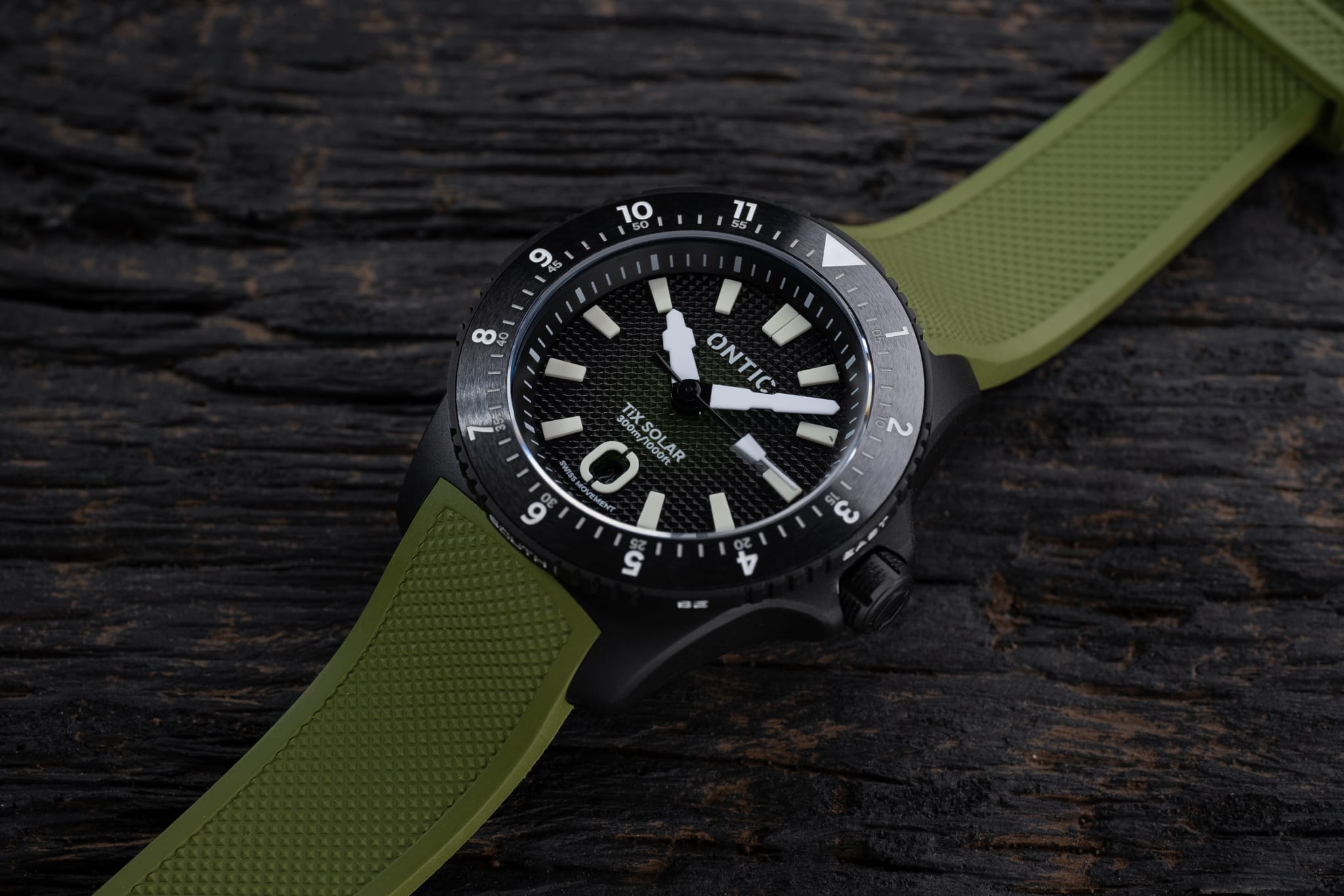 Working from the outside in, a simple minute track is printed in white onto the deep, sloping rehaut. On the Marine Diver the minute markers at 3, 6, 9 and 12 o’clock are accented in orange to match the bezel, whilst the Duty collection watch is printed white only. The bold isosceles trapezoid-shaped hour markers are cast from solid blocks of Super LumiNova. A date window sits at six o’clock surrounded by an applied and lumed frame which mimics the stylised ‘O’ from the brand’s logo, a nice touch! However, the date window itself is recessed so deep into the dial that it’s actually difficult to read it. On my review watches the date window was colour-matched, but at time of publishing John is yet to decide whether to keep it colour-matched or go black-on-white. There are pros and cons to each option, but for this particular watch I’d personally prefer black on white. The reason being that the date window sits so deep into the dial that legibility suffers. The hour and minute hands are bold and feature a design which is unique to Ontic, something that’s always nice to see. The seconds hand, orange on the Marine, black and white on the Duty, has a lume pip that echoes the shape of the hour markers. Dial text comprises the Ontic logo at 12 o’clock, balanced by ‘TiX SOLAR’ and ‘300m/1000ft’ at six. ‘SWISS MOVEMENT’ in smaller font beneath the date window.