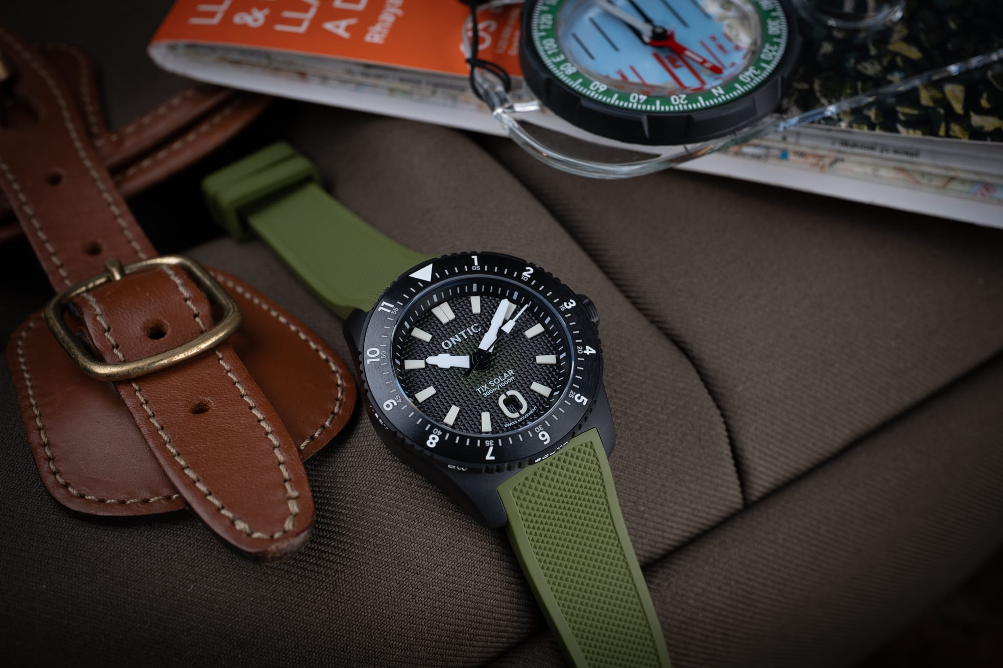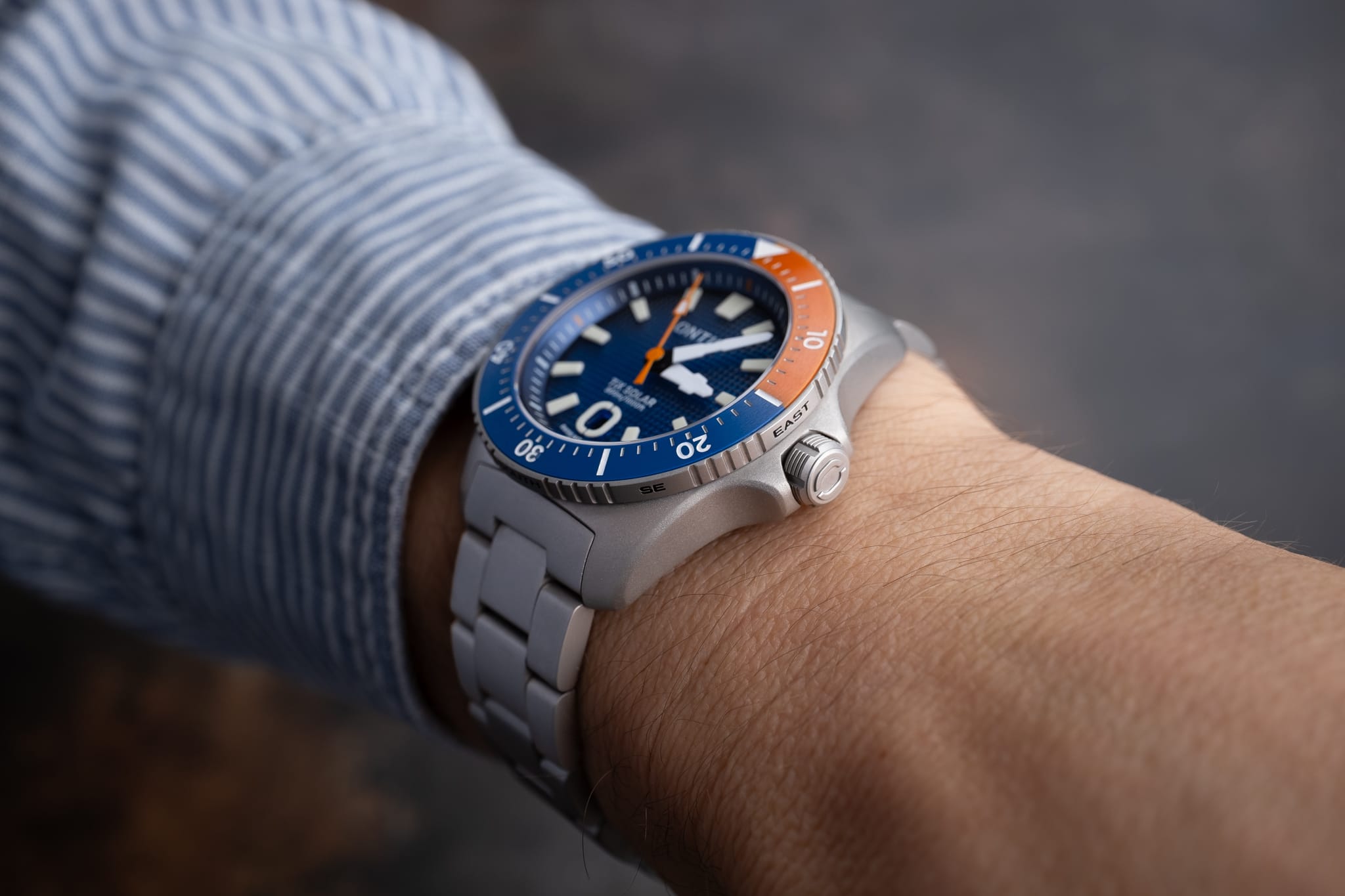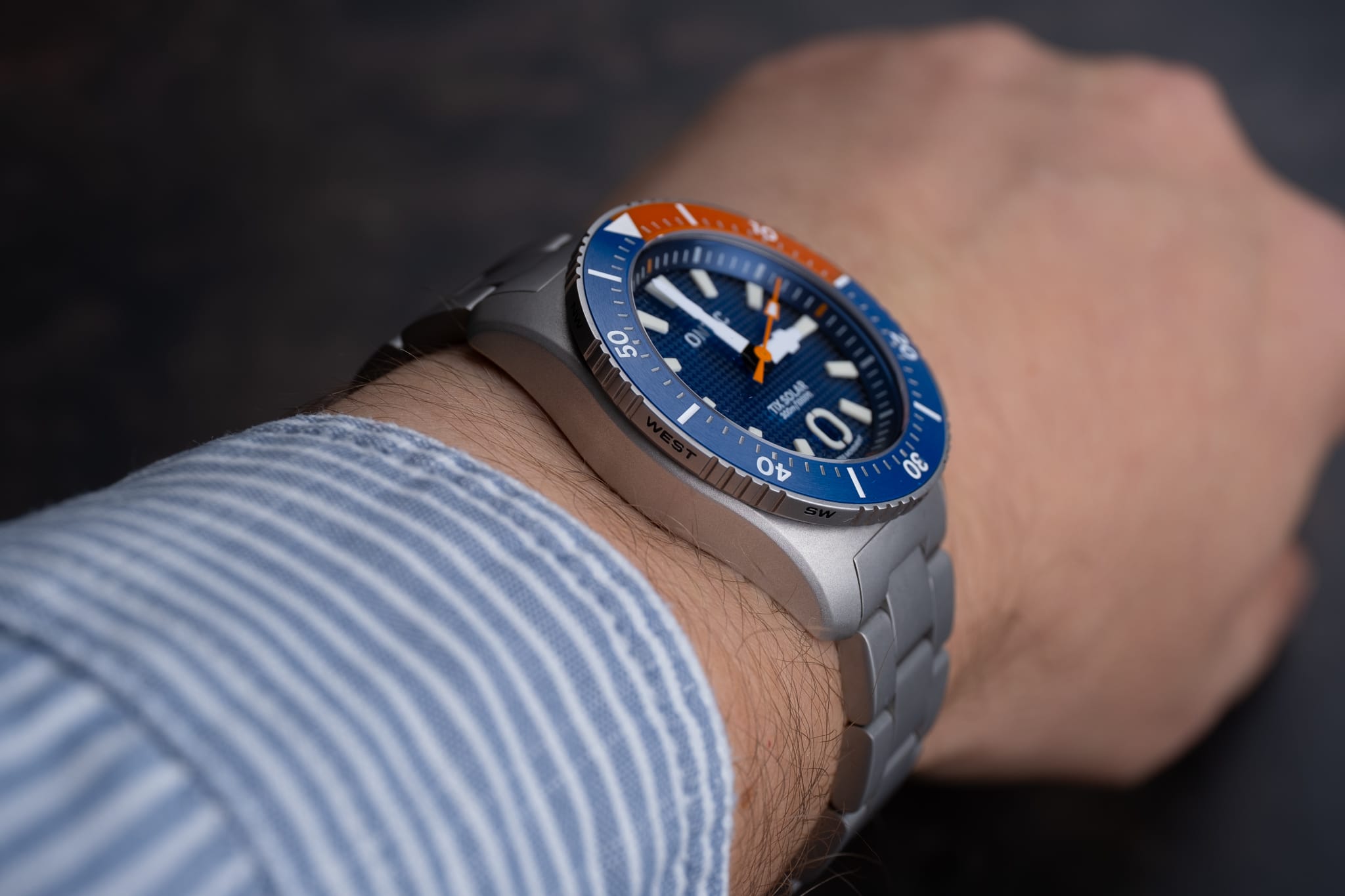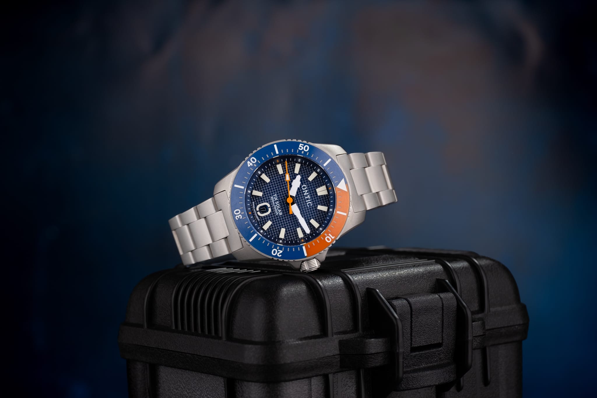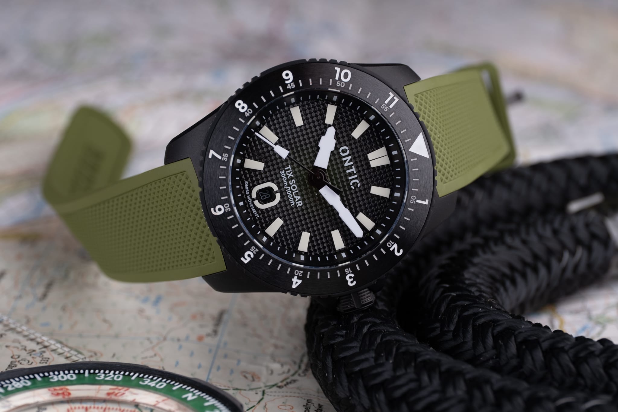 Working from the outside in, a simple minute track is printed in white onto the deep, sloping rehaut. On the Marine Diver the minute markers at 3, 6, 9 and 12 o’clock are accented in orange to match the bezel, whilst the Duty collection watch is printed white only. The bold isosceles trapezoid-shaped hour markers are cast from solid blocks of Super LumiNova. A date window sits at six o’clock surrounded by an applied and lumed frame which mimics the stylised ‘O’ from the brand’s logo, a nice touch! However, the date window itself is recessed so deep into the dial that it’s actually difficult to read it. On my review watches the date window was colour-matched, but at time of publishing John is yet to decide whether to keep it colour-matched or go black-on-white. There are pros and cons to each option, but for this particular watch I’d personally prefer black on white. The reason being that the date window sits so deep into the dial that legibility suffers. The hour and minute hands are bold and feature a design which is unique to Ontic, something that’s always nice to see. The seconds hand, orange on the Marine, black and white on the Duty, has a lume pip that echoes the shape of the hour markers. Dial text comprises the Ontic logo at 12 o’clock, balanced by ‘TiX SOLAR’ and ‘300m/1000ft’ at six. ‘SWISS MOVEMENT’ in smaller font beneath the date window.