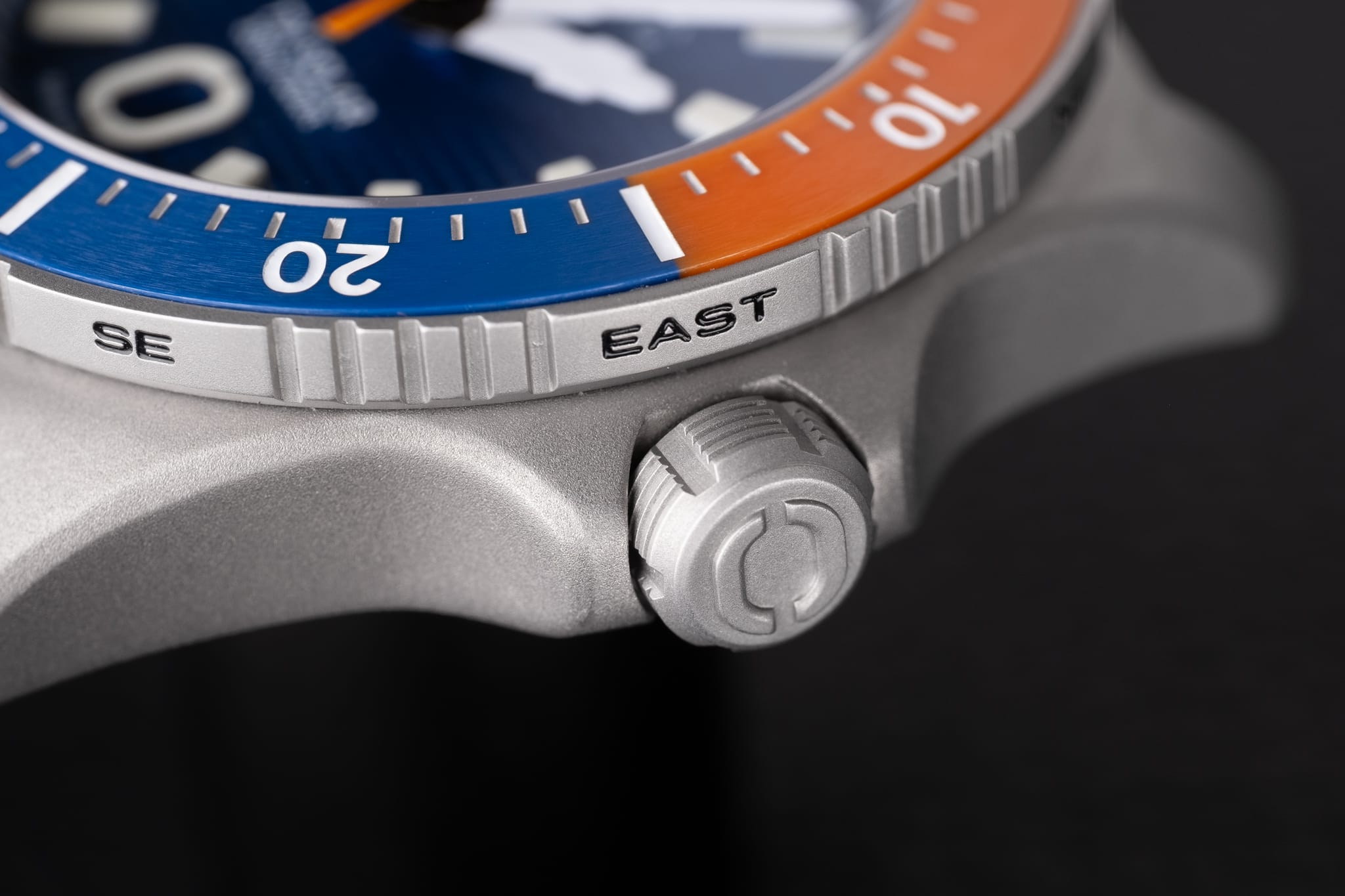 The 120-click rotating bezel has a concentrically-brushed ceramic insert with engraved markings which are filled with Super LumiNova. Dive variants feature bi-coloured fully graduated countdown inserts (blue and orange on my Marine) with Arabic numerals at 10-minute intervals, except for the ‘Tribute’ which has Arabic numerals at five-minute intervals with orange accents. All other sub-collections feature monochrome 12-hour bezels more suited to tracking a second time zone, although of course unless you’re actually diving you can use them to time things also. The bezel edge comprises sections of deep linear knurling arranged in vertical strips of five, interspersed with engraved compass points which are painted black and can be used to help navigate using the sun. The bezel is very easy to grip and has a nice positive feel to the action with no back-play. The bezel lined up perfectly on one of my review watches but was very marginally off on the other. However, John at Ontic has assured me that quality control will be tightened for the production watches. The flat sapphire crystal has a triple layer of anti-reflective coating applied to the inside and sits flush with the bezel.